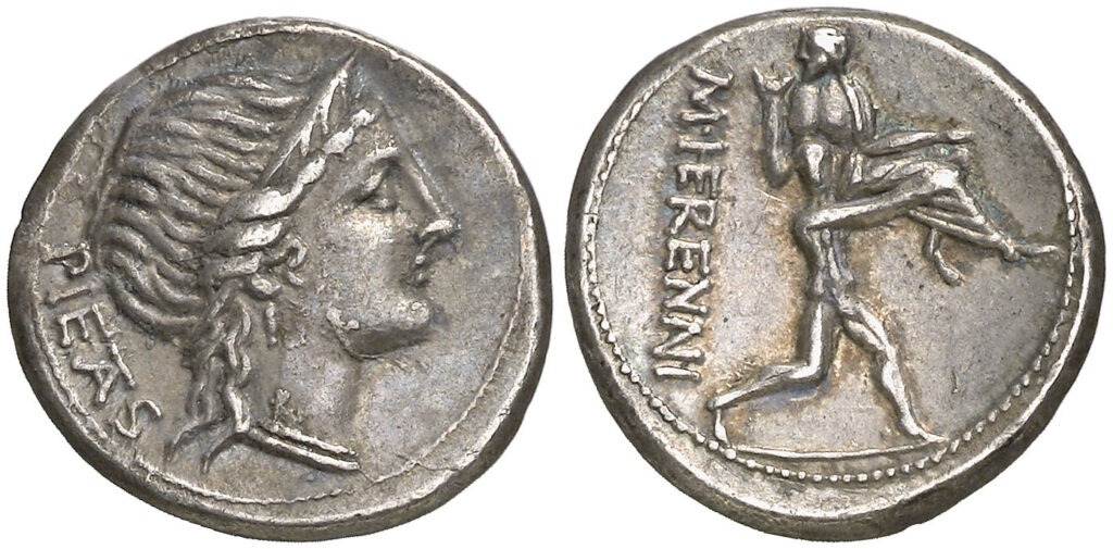 Le type du denier de M. Herennius fait allusion au dévouement des deux frères Amphinomus et Anapias de Catane, qui, lors d’une éruption de l’Etna, emportèrent leurs vieux parents sur leurs épaules, à l’exemple d’Enée qui sauva son père Anchise. Ce fait de piété filiale est raconté notamment par Valère Maxime et par Pausanias. Les deux frères sont représentés, soit isolément, soit ensemble, sur les monnaies de Catane, leur ville natale, où les ancêtres de la gens Herennia étaient établis pour faire le commerce avec l’Afrique. Borghesi pense même que Herennius Siculus, l’aruspice et l’ami de C. Gracchus était originaire de Catane c’était probablement le père ou le grand-père de notre monétaire. Le même type se trouve sur les monnaies de Sextus Pompée qui ont été frappées à Catane. La tête de la Piété, au droit, est une allusion à la piété filiale d’Amphinomus et d’Anapias appelés les Pieux, et le lieu de leur sépulture portait le nom de campus piorum. Mommsen pense, en outre, que ce type de la Piété fait allusion à la fidélité de Herennius Siculus à l’égard de C. Gracchus, fidélité qu’il scella de son sang.