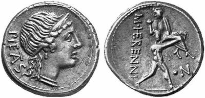Sur les médailles, on trouve le nom d’un M. Herennius qui doit être le fils du consul de l’an 661 (93 av. J.-C.). Pline mentionne le consulat de ce personnage comme remarquable par la quantité considérable de silphium qui fut alors apportée à Rome. Ce fils fut lui-même père de Herennius Picens, car ce dernier était fils d’un Marcus. Cavedoni regardait les pièces ci-dessous décrites comme frappées par M. Herennius Nepos vers l’an 646 (108 av. J.-C.). Nous les plaçons vers l’an 655 (99 av. J.-C.).