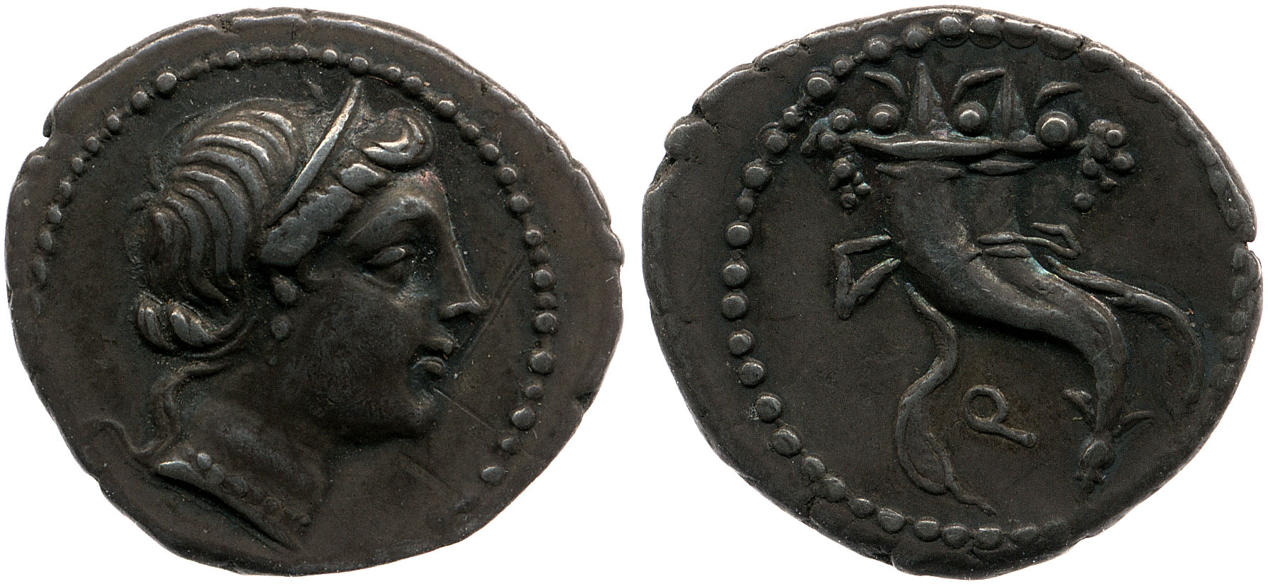 La tête de Vénus est liée au monnayage de Sylla. C’est une émission d’urgence frappée en Italie et certainement liée aux opérations militaires qui amenèrent Sylla à prendre le pouvoir et à s’emparer de Rome. Pour ce type, il existe aussi un aureus (RCV. 8) qui est unique. Au revers le Q devrait être traduit par quæstor. M. Crawford indique que la double corne d’abondance ferait référence à la Fortune. Ce denier est frappé après l’entrée de Sylla à Rome et les auteurs anciens liaient la double corne d’abondance aux dons en nature que la plèbe romaine aurait reçues pour pallier à la crise frumentaire liée à la guerre Civile.