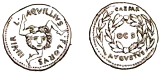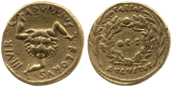 Avers : L.AQVILLIVS.FLORVS. III.VIR  (L.Aquillius.Florus. III.VIR Triumvir monétaire)