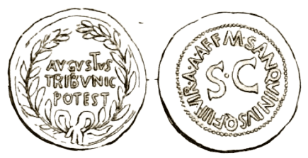 Avers : AVGVSTVS TRIBVNIC POTEST (Auguste revêtu de la Puissance Tribunitienne)