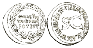 Avers : AVGVSTVS TRIBVNIC POTEST (Auguste revêtu de la Puissance Tribunitienne)