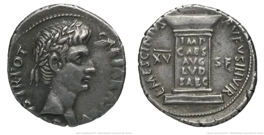 Ce rare denier célèbre les Ludi Saeculares (jeux séculaires) de l’année précédente, célébrées par Auguste comme XV vir sacris faciundis. Le XV viri a distribué aux citoyens des sufiments de purification, des dons de soufre, de bitume et d’autres produits inflammables utilisés pour les torches, aux citoyens quelques jours avant les Jeux séculiers. Les citoyens utiliseraient ensuite les flambeaux lors des cérémonies suivantes.