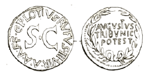 Avers : AVGVSTVS TRIBVNIC POTEST (Auguste revêtu de la Puissance Tribunitienne)
