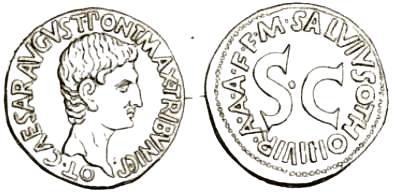 Avers : CAESAR AVGVST. PONT. MAX. TRIBVNICPOT. (Caesar Augustus, pontifex maximus, tribunicia potestate)