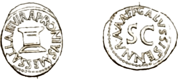 Revers : GALVS. SISENNA. A. A. A. F. F. (Galus, Sisenna, Triumvir, auro argentum aeri flando feriundo; Galus, Sisenna, magistrat en charge de la préparation des flans et de la frappe des monnaies de l’or, de l’argent et du bronze).