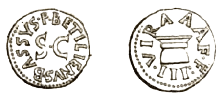 Revers : IIIVIR A A A F F (Triumvir, auro argentum aeri flando feriundo; magistrat en charge de la préparation des flans et de la frappe des monnaies de l’or, de l’argent et du bronze).