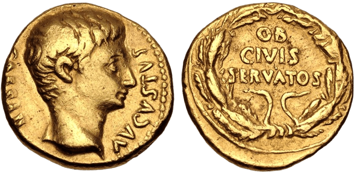 Le revers représente la couronne de chêne, la Corona Civica, décernée à Auguste par le Sénat pour avoir sauvé la République.