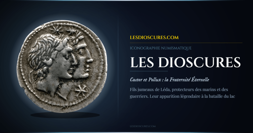 Les Dioscures — Castor et Pollux — sont parmi les figures mythologiques les plus présentes de toute la numismatique républicaine romaine. Depuis les premiers deniers anonymes frappés après 211 av. J.-C. jusqu’aux émissions des grandes familles de la fin de la République, leur image au revers — deux cavaliers cuirassés galopant à droite, coiffés du pilos étoilé, lances à la main — est le revers fondateur du denier romain. C’est avec cette iconographie que Rome a défini son premier langage numismatique.