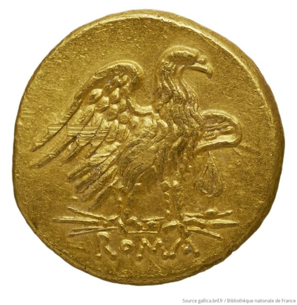 L’aigle sur le monnayage de la république romaine Il existe de nombreuses représentations de ce rapace, 72 exemplaires référencées sur LesDioscures.com, avec de diverses significations mais elles sont généralement liées à Jupiter. Pour plus d’informations sur une monnaie, cliquez sur la vignette pour obtenir sa fiche détaillée. L’aigle des légions On retrouve souvent cette enseigne de la légion sur le monnayage de la république, avec les ailes étendues. L’aigle est incontestablement l’animal dominant sur les enseignes militaires romaines. Deniers des légions de Marc Antoine Denier de Lucius Pinarius Scarpus Denier de Tiberius Sempronius Graccus Denier Octave Denier de Cnæus Nerius Denier Serratus d’Aulus Postumius Albinus Denier de Caius Valerius Flaccus Aigle sur un foudre Denier de Petillius Capitolinus Denier de Quintus Cassius Longinus Denier de Marcus Plætorius Cestianus Denier Serratus de Lucius Aurelius Cotta Aureus – Anonymes (60, 40 et 20 asses) Didrachme Anonyme Aigle attisant le feu Le revers de ces deniers fait référence à la fondation de la cité par Énée. Pendant que le prince et les Troyens travaillaient, ils découvrirent une louve en train d’allumer un feu et un aigle l’aidant à l’attiser. Ils décidèrent de fonder la nouvelle cité à cet endroit. Denier de Lucius Papius Celsus Aigle seul Quinaire de Manius Cordius Quinaire de Manius Cordius Sextans Anonyme Tête d’aigle Cette tête d’aigle se retrouve sur les deniers et les aureus frappés par Crassus et Scipion en rapport avec Jupiter Terminalis. Denier Scipion et Crassus Symbole de puissance continentale Denier Pompée – Terentius Varro Symbole de Jupiter Denier de Lucius Cornelius Lentulus
