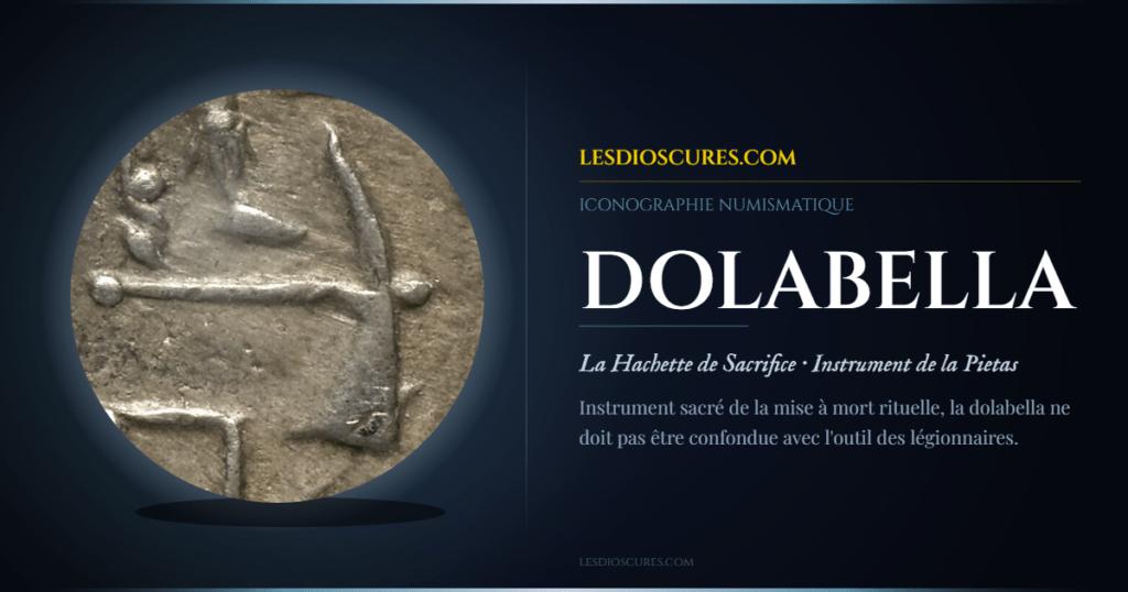 Dolabella · Hachette sacrificielle · Iconographie numismatique · LesDioscures Dolabella Hachette sacrificielle · Rite du victimarius · Outils pontificaux · Gens Cornelia Nature Hachette rituelle Usage principal Mise à mort sacrificielle Officiant Victimarius À ne pas confondre Dolabra (outil militaire) Cognomen célèbre P. Cornelius Dolabella La dolabella était une petite hache ou hachette romaine dont la forme était spécifiquement adaptée aux rites sacrificiels. Contrairement à une hache de travail (la securis), la dolabella était un instrument de cérémonie : son rôle principal était de mettre à mort l’animal sacrifié lors des rituels publics et privés. Elle figure parmi les outils pontificaux représentés sur les monnaies de la République romaine, aux côtés du simpulum, du culter et du lituus — autant d’attributs qui signalent la pietas de la famille du magistrat monétaire et son attachement aux traditions religieuses romaines. « La dolabella symbolisait l’autorité et la légitimité du rituel. Elle était souvent représentée sur les autels et les monuments funéraires, aux côtés d’autres instruments sacrificiels, pour souligner la piété du défunt ou de la personne ayant ordonné le sacrifice. » — Christopher Mérat, Dolabella, LesDioscures.com ✦ La dolabella — Description et usage rituel 01 Instrument de sacrifice · Le rôle du victimarius Religion romaine · République & Empire Denier Anonyme · Hache à sacrifice (dolabella) La dolabella était l’un des instruments les plus importants dans le cadre des sacrifices publics et privés. Le sacrifice romain était une cérémonie complexe et hautement ritualisée — la mise à mort n’était pas un acte de violence brute, mais une étape sacrée dont chaque geste devait être accompli avec précision pour garantir la validité du rite. 🪓 Fonction principale Mise à mort de l’animal sacrifié. Acte confié au victimarius, assistant spécialisé distinct du prêtre officiants (pontife, augure, flamine). 🔪 Le culter Couteau de sacrifice utilisé en complément de la dolabella — parfois pour l’égorgement après l’étourdissement par la hachette. 🏛️ Monuments funéraires La dolabella est fréquemment représentée sur les autels et reliefs funéraires, signalant la pietas du défunt et la régularité des rites accomplis en son honneur. 👁️ Symbole d’autorité Sa présence sur une monnaie symbolise la légitimité religieuse de la famille du magistrat — son droit à officier et à garantir la pax deorum. ⚡ Dolabella vs Dolabra — Ne pas confondre Il est important de distinguer la dolabella (hachette de sacrifice, outil cérémoniel) de la dolabra. La dolabra était un outil polyvalent de l’armée romaine, combinant une hache et une pioche, utilisé principalement par les légionnaires pour la construction de fortifications et de tranchées. Bien que les deux noms soient similaires, leurs fonctions et leurs usages étaient radicalement différents — l’une appartient à la sphère du sacré, l’autre à celle de la guerre. ✦ Les outils pontificaux — Ensemble iconographique 02 La dolabella parmi les instruments sacrificiels Simpulum · Patera · Culter · Praefericulum Denier Sulpicia · RRC 406/1 · Publius Sulpicius Galba La dolabella s’inscrit dans un ensemble plus large d’outils pontificaux et sacrificiels que les magistrats monétaires représentaient volontiers sur leurs deniers pour signaler leur appartenance à des collèges sacerdotaux ou leurs fonctions religieuses : 🥄 Simpulum (Capis) Petite louche à long manche pour puiser le liquide sacré — évitant tout contact impie avec les doigts lors des libations. 🏺 Praefericulum Vase de métal à bouche proéminente pour les libations — contient le vin ou les liqueurs réservés aux dieux lors du sacrifice. 🫙 Patera Coupe plate sans anse utilisée pour verser les libations sur l’autel — l’un des attributs les plus fréquents dans l’iconographie religieuse romaine. 💦 Aspergillum Aspersoir servant à réaliser des gestes sacrés de purification — répandre l’eau lustrale sur l’animal et les participants avant le sacrifice. Le denier Sulpicia de Publius Sulpicius Galba (RRC 406/1, édile curule en 69 av. J.-C.) représente au revers l’association caractéristique : couteau, simpulum, hache à sacrifices — les trois instruments que maniait le victimarius lors du sacrifice. La présence de la Vesta voilée à l’avers renforce le registre sacerdotal de l’ensemble. ✦ Dolabella — Un cognomen illustre 03 Publius Cornelius Dolabella — Gendre de Cicéron Gens Cornelia · 44 av. J.-C. Le nom Dolabella était également un cognomen (surnom de famille) porté par plusieurs membres d’une branche de la gens Cornelia à Rome. L’un des plus célèbres fut Publius Cornelius Dolabella, consul suffect en 44 av. J.-C. et gendre de Cicéron — celui-ci lui consacra plusieurs lettres dans sa correspondance, oscillant entre espoir politique et désillusion. ⚡ L’Arc de Dolabella et Silanus Il existe également l’Arc de Dolabella et Silanus à Rome, construit par les consuls de l’an 10 ap. J.-C. qui n’a pas de lien direct avec la hachette sacrificielle, mais avec les personnes qui l’ont fait ériger. Cet arc est aujourd’hui encore visible sur le Caelius — à ne pas confondre avec les représentations de l’outil rituel sur les monnaies. Ce cognomen illustre la pratique romaine de tirer les surnoms familiaux des métiers, des apparences physiques ou des fonctions ancestrales : Dolabella (diminutif de dolabra) suggère peut-être un ancêtre particulièrement habile au maniement de la hache — militaire ou sacrificielle. ✦ Fiches numismatiques & articles liés Monnaies et articles en lien avec les instruments sacrificiels Anonyme · République romaine Denier Anonyme · Hache à sacrifice Denier républicain anonyme portant la hache sacrificielle (