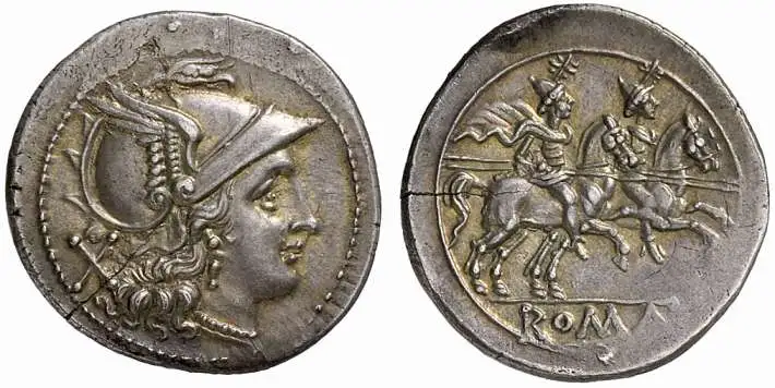 Deniers anonymes · Les Dioscures · Iconographie numismatique · LesDioscures Deniers anonymes · Les Dioscures Guide des variétés · Iconographie numismatique · République romaine Nature Denier anonyme Avers Tête de Roma casquée Revers Les Dioscures à cheval Période Après 211 av. J.-C. Références 19 types référencés Cet article est un guide de classification présentant les différentes variétés de deniers anonymes de type « Les Dioscures ». On retrouve systématiquement sur ces monnaies la tête de Roma casquée au droit et les Dioscures à cheval au revers, sans symbole ni légende additionnels. Ces deniers sont fréquemment mal attribués par les collectionneurs, marchands et musées. Ce guide, volontairement simplifié, a pour vocation d’aider à une meilleure classification en identifiant, pour chaque type, les caractéristiques stylistiques distinctives — visière du casque, traitement des cheveux de Roma, position de la queue des chevaux, style de cape des cavaliers et cadre de la légende ROMA. « Ces monnaies, dépourvues de toute signature de magistrat, nous parlent pourtant d’une époque charnière — celle de la Rome républicaine qui forge sa monnaie dans le feu des guerres puniques. » — LesDioscures.com · Guide de classification numismatique ✦ Attributs iconographiques communs 00 Éléments typologiques des deniers Dioscures Toutes variétés L’ensemble des deniers anonymes de type Dioscures partage un socle iconographique commun, décliné avec des variations stylistiques permettant leur classification. ⚔️ Tête de Roma Casquée, vue de profil à droite, avec visière variable selon la série. ✦ Étoiles des Dioscures Étoiles au-dessus des cavaliers, leur forme et position varient selon les groupes. 🐴 Cavaliers au galop Les deux Dioscures au revers, galopant à droite avec lance et cape. 🏷️ Légende ROMA Au revers, en relief ou semi-incuse, dans un cadre dont la forme distingue les variétés. ✕ Marque de valeur X Indique la valeur de 10 as. Sa taille et sa forme sont caractéristiques de certaines variétés. 🌊 Style de cape Drapeau, continu, coulant, ondulant ou en forme de B — critère de classification majeur. ⚡ Problème d’attribution — Une mise en garde essentielle Les deniers anonymes de type Dioscures sont parmi les monnaies républicaines les plus fréquemment mal attribuées. La référence 165AN (Cr44/5) est notamment confondue avec les références 171AN (Cr46/1) et 293AE (Cr75/1c), qui présentent un style superficiellement similaire. L’examen minutieux de la visière du casque, du traitement des cheveux de Roma et du cadre de la légende ROMA au revers permet dans la grande majorité des cas une attribution correcte. ✦ 1 · Denier 165AN · Crawford 44/5 01 Denier 165AN (Cr44/5) — Vue d’ensemble Après 211 av. J.-C. Le denier 165AN ou Cr44/5 est la première et la plus importante référence de ce guide. Elle contient six grandes sous-variétés et un nombre significatif de variations secondaires. Les représentations de Roma sur ces deniers présentent toutes des visières d’extrémité évasées ou émoussées — aucune n’a de visière à pic. Cette référence se trouve avec une légende ROMA à demi (ou pseudo) incuse, ainsi qu’avec une légende en relief au verso. 01·1 Variante 1 — Petite tête, visière courte Cr44/5 · Variante 1 🏛 Visière évasée courte · Queue droite · ROMA semi-incuse Denier 165AN (Cr44/5) · Variante 1 · Collection ANS 🏛 Description typologique Droit Tête de Roma généralement petite par rapport au motif global, particulièrement par rapport à la marque de valeur «X». Visière courte dépassant peu du casque, composée de deux ou trois lignes droites progressivement évasées depuis la charnière. Bordure de diamètre relativement petit, laissant souvent une grande surface de flan hors de la bordure perlée. Revers Queue du cheval s’étendant assez droit derrière le cheval. Cavaliers bien proportionnés aux chevaux relativement minces. Légende ROMA épelée sur une tablette surélevée en lettres semi-incuses. Caractéristiques distinctives Petite tête de Roma à visière courte légèrement évasée, deux ou trois lignes droites ne s’étendant pas loin du front Queue du cheval s’étendant assez droit derrière le cheval N.B. : il existe une variation avec une cape d’un Dioscure qui diffère 01·2 Variante 2 — Grande tête, visière allongée Cr44/5 · Variante 2 🏛 Visière à lignes incurvées · Queue vers le bas · ROMA partiellement incuse Denier 165AN (Cr44/5) · Variante 2 · Collection ANS 🏛 Description typologique Droit Style primitif similaire à la variété précédente, mais tête beaucoup plus grande. Visière s’allongeant bien au-delà du casque, divisée en 3 lignes aux extrémités légèrement incurvées l’une de l’autre. Parfois point sous la troncature du cou. Revers Dioscures plus grands par rapport aux chevaux. Légende ROMA partiellement incuse. Queue du cheval traînant vers le bas. Partie gauche incurvée du cadre autour de la légende. Caractéristiques distinctives Visière évasée avec lignes extérieures presque toujours légèrement incurvées en directions opposées, s’étendant plus loin du casque Queue de cheval vers le bas Partie gauche incurvée du cadre autour de la légende ROMA 01·3 Variante 3 — Aile inclinée, mèches lâches Cr44/5 · Variante 3 🏛 Aile de casque vers le bas · Cheveux dénoués · Queue allongée Denier 165AN (Cr44/5) · Variante 3 · Collection ANS Cette variété se caractérise par une aile de casque inclinée vers l’arrière ou vers le bas, contrairement à toute autre variété, ainsi que par des lanières desserrées sous le casque sans fixation des cheveux (style dit des « mèches lâches »). Caractéristiques distinctives Visière définie par deux longues lignes droites depuis la charnière, une troisième ligne courte entre elles parta