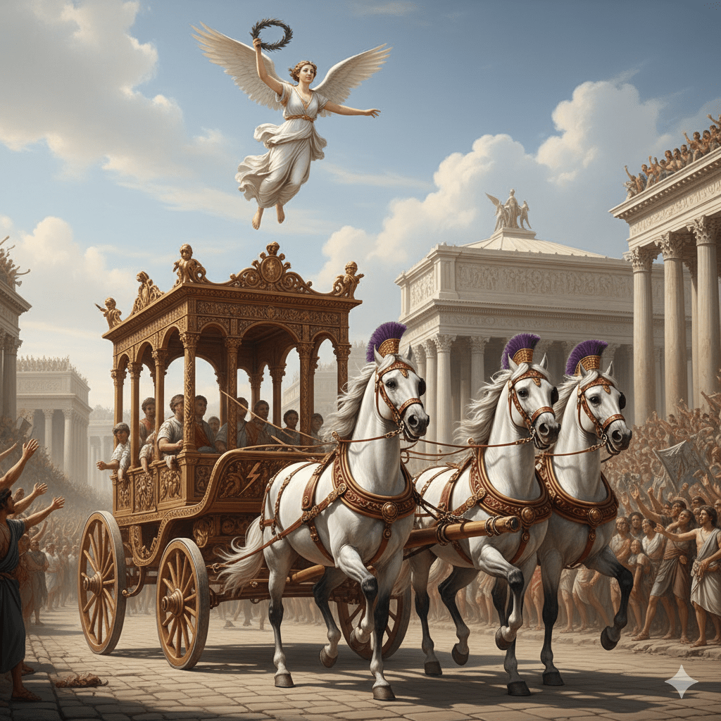 Ce char n’était pas un véhicule militaire ou de course, mais une voiture d’apparat, richement ornée et souvent tirée par quatre chevaux (quadriga), réservée exclusivement aux divinités. Sa présence lors de la Pompa Circensis (le cortège inaugural des Jeux) symbolisait le rôle actif et la bénédiction des dieux sur la ville.
