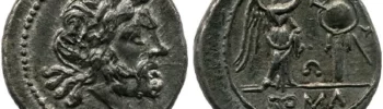 Le victoriat, une monnaie singulière… Les deux principales raisons qui font que le victoriat est une monnaie singulière, sont qu’avant tout, sa production n’aura duré qu’environ quarante années et que d’autre part, il s’agit de la seule monnaie de la république romaine, de cette période, qui ne possède aucune marque de valeur. 1 – Préambule Jusqu’à environ 211 ans avant J.C., les pièces d’argent de Rome étaient similaires en poids et en argent aux didrachmes de la grande Grèce (sud de l’Italie et de la Sicile). Jusqu’à la Seconde Guerre punique (218 av. J.-C. – 200 av. J.-C.). La production monétaire était plutôt modeste, reflétant une utilisation dans les échanges avec les villes du sud plutôt qu’une monétisation interne complète de Rome. Les exigences de la guerre avec Carthage créèrent un besoin bien plus grand, auquel répondait la fabrication intensive de didrachmes connus également sous le nom de quadrigatus (a) (le revers représente Jupiter conduisant un char à quatre chevaux, un quadrige). Après les terribles défaites de Cannae et de Trebia, Rome a été contrainte de réduire le poids et la finesse des quadrigati. Certains des derniers quadrigati pèsent moins de cinq grammes et contiennent moins de 50% d’argent. a) Exemplaire de quadrigatus frappé entre 225 et 217 avant J.C. (b) Premier denier émis en 211 avant J.C. Après le succès de Rome au siège de Syracuse, la plus riche des villes siciliennes qui était sous le contrôle d’Hannibal, la roue de la fortune tourna rapidement et de façon spectaculaire en faveur de Rome, créant un important afflux de richesses, essentiellement sous la forme d’argent rapporté de Syracuse. Rome devenait alors rapidement une économie entièrement monétisée et la disponibilité soudaine d’énormes quantités d’argent a conduit à la création d’une nouvelle unité monétaire, le denier (b), une pièce de monnaie d’une fois à trois fois le poids et la teneur en argent d’une drachme traditionnelle de la Grande Grèce. 2 – Création du victoriat Émis pour la première fois aux alentours de 211 avant J.C., le denier a été frappé avec un poids de quatre scrupules (un scrupule équivaut à environ 1,12 gramme). Cependant, Rome reconnaissait le besoin persistant de créer d’autres pièces de monnaie selon l’ancienne norme didrachme / drachme (probablement pour l’achat de fournitures auprès d’autres villes ou pour le commerce ou la corruption pure et simple de villes et de l’aristocratie de la Grande Grèce et / ou le paiement d’alliés des villes desservies par l’armée romaine). Par conséquent, à peu près au même moment, Rome créa une deuxième pièce, appelée victoriat (c), frappée avec un poids de trois coups scrupules. A l’époque de la frappe du victoriat, le commerce très actif de Rome avec les villes de l’Adriatique était principalement alimenté par les drachmes d’Apollonie et de Dyrrachium dont le type est une vache allaitant son veau (d). Le victoriat présente au droit la tête de Jupiter et au revers Victoire couronnant un trophée. Alors que le denier et ses fractions étaient en argent de qualité (atteignant souvent 98% de finesse), le victoriat était une monnaie dégradée tout au long de sa production entre 211 et 170 avant J.C. Il représentait en moyenne environ 70% d’argent (mais avec des variations considérables) et, contrairement au denier, ne portait aucune indication de valeur. Ainsi, intrinsèquement, un victoriat valait environ un demi denier (75% x 70% = environ 50%). Mais si l’on ne savait pas qu’il était abaissé et jugé simplement en fonction du poids, on aurait alors pensé que cela valait 3/4 du denier (3 scrupules contre 4 scrupules). Dans les différents trésors monétaires, les victoriats ne se retrouvent presque jamais mélangés avec des deniers, mais plutôt seuls. Cela indique que sa nature dégradée était bien connue dans le monde romain. D’autre part, les victoriats ont été fabriqués pendant quarante ans, alors Rome a dû avoir le sentiment qu’ils ont eu un certain succès. (c) Premier victoriat émis en 211 avant J.C. (d) Exemplaire d’une drachme d’Illyrie émis entre 620 et 294 avant J.C. (3.23gr) 3 – Attribution des victoriats 3-1 Victoriats attribués Bien que très souvent anonymes, quatre magistrats monétaires ont pu être attribués à ces monnaies grâce à leurs légendes. Victoriat ValériaÉmis entre 211 et 210 avant J.C. par M. Valerius Laevinus. Légende: (KOP) (VAL) Victoriat CaeciliaÉmis entre 194 et 190 avant J.C. par Caecilius Metellus. Légende: (ME) Victoriat BaebiaÉmis entre 194 et 190 avant J.C. par Cnaeus Baebius Tampilus. Légende: (TAMP) Victoriat MatienaÉmis entre 179 et 170 avant J.C. par Matienus. Légende: (MAT) 3-2 Victoriat avec légende non attribué Ci-dessous, une liste de victoriats possédant une légende (parfois seulement une lettre) mais qui ne sont pas attribués. Victoriat AnonymeÉmis entre 211 et 208 avant J.C. Légende: C au droit et M au revers Victoriat AnonymeÉmis entre 211 et 208 avant J.C. Légende: CROT Victoriat AnonymeÉmis entre 211 et 208 avant J.C. Légende: (MP) Victoriat AnonymeÉmis entre 211 et 208 avant J.C. Légende: N inversé au droit Victoriat AnonymeÉmis entre 211 et 208 avant J.C. Légende: (VB) Victoriat AnonymeÉmis entre 211 et 210 avant J.C. Légende: T Victoriat AnonymeÉmis entre 211 et 210 avant J.C. Légende: (TL) Victoriat AnonymeÉmis entre 211 et 210 avant J.C. Légende: Q Victoriat AnonymeÉmis entre 211 et 210 avant J.C. Légende: (MT) 3-3 Victoriat avec symbole non attribué Ci-dessous, une liste de victoriats possédant un symbole non attribués. Ces symboles peuvent être soit un objet ou soit un animal. Ils pourraient être le symbole de certaines gens, à titre d’exemple, le chien se retrouvera plus tard sur des monnaies des Antestii. Victoriat AnonymeÉmis en 207 avant J.C. Symbole: 