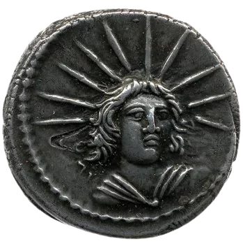 - Représentations artistiques : Sol est typiquement montré comme un jeune homme imberbe avec une couronne de rayons ou une auréole. Il porte une tunique légère ou un manteau flottant, tenant parfois un fouet (pour guider les chevaux) ou un globe (symbole de domination cosmique).