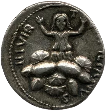 - Une fois les Sabins entrés dans la citadelle, ils l’écrasent sous leurs boucliers (également portés au bras gauche), soit pour punir sa traîtrise, soit pour masquer leur dépendance à une trahison pour leur victoire. Cette version est illustrée sur une monnaie d’Auguste montrant Tarpeia ensevelie sous les boucliers.